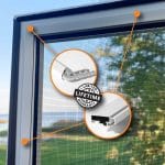 Novieto insektu sietu uz durvju rāmja ar zaļo uzlīmi augšpusē. Atzīmē vietas, kur paredzēts urbt caurumus skrūvēm (ja nepieciešams).
